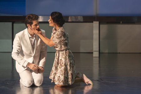 Avec autant de charme que de chien, Sandrine Buendia se glisse dans le rôle de Célia, l’empathique nymphe étrangleuse, et forme un couple parfait avec Romain Dayez dont le beau baryton colle aussi bien au spectre qu’il est au départ qu’à l’amant passionné que l’on découvre après immersion dans la baignoire. Voix lumineuse et bien projetée, le jeune ténor Fabien Hyon apporte vigueur et santé à un Gobineau aussi fier de son établissement qu’attiré par Célia - aucune chance Nestor ! Anna Destraël offre un personnage drôle et zélé en Commandante de la Police des Thermes totalement dépassée par le surnaturel de la situation, au côté du très pittoresque et zozoteur Prosper Lampon de Geoffroy Buffière. Nicolas Certenais (Aristide), Benjamin Mayenobe, Benoît-Joseph Meier et Jérémie Brocard (trois curistes) sont parfaits dans les rôles secondaires. Enfin, on s’en voudrait d’oublier Les Eléments de Joël Suhubiette, aussi bien préparés qu’impliqués dans la production : un vrai chœur de théâtre !